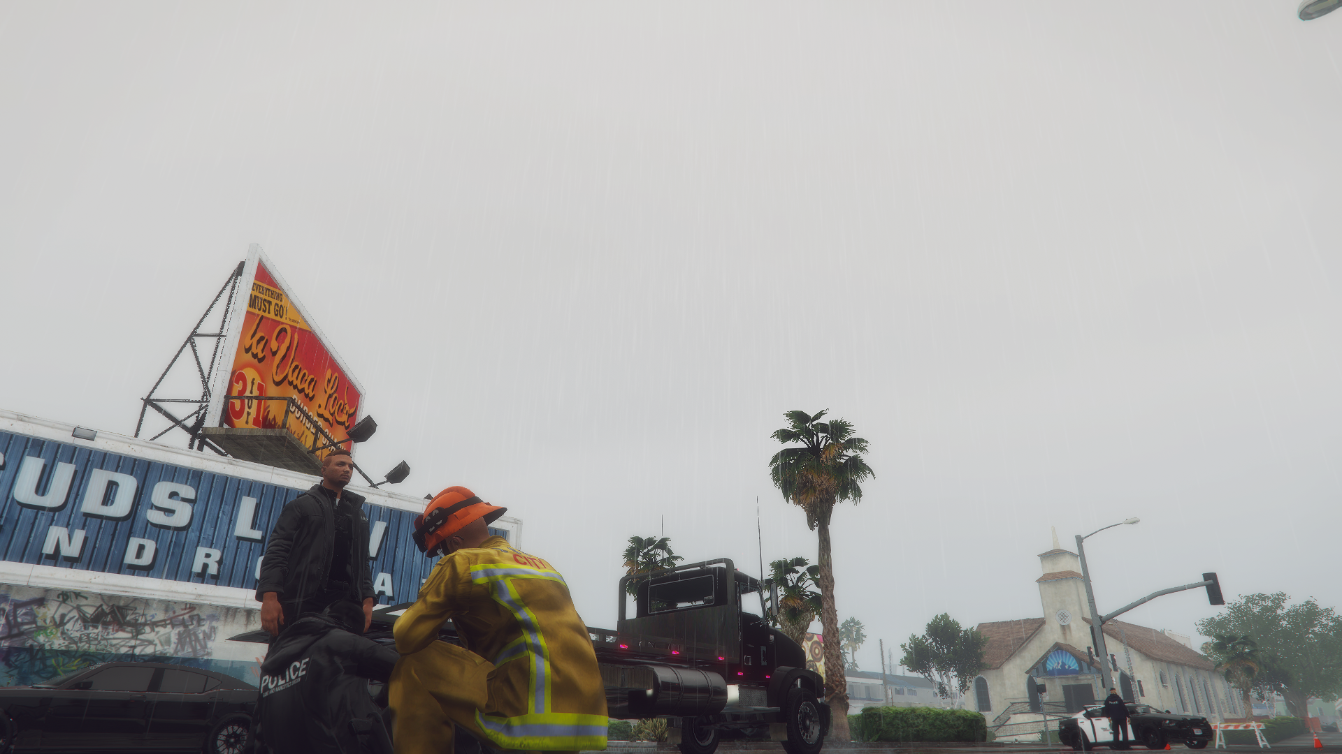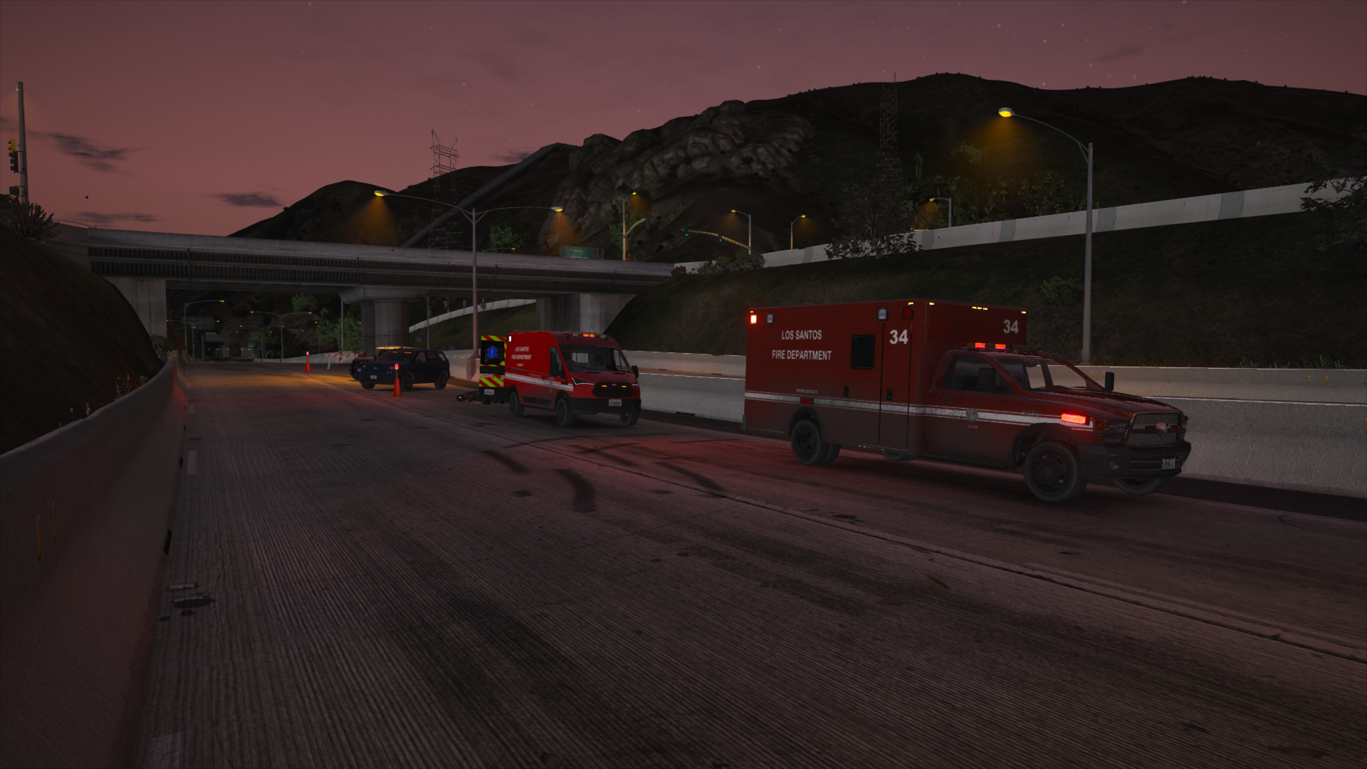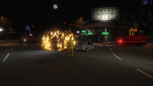 Nos encontramos actuando en Boulevard del Perro con Morningwood Boulevard junto a @lspd, debido a un accidente de tráfico entre dos vehiculos, el cual ha provocado un incendio debido al gas de uno de los vehículos.