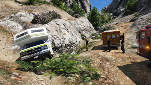 Nos encontramos actuando en el Parque Natural del Monte Chiliad debido a una accidente en el que se encuentra involucrada una autocaravana.