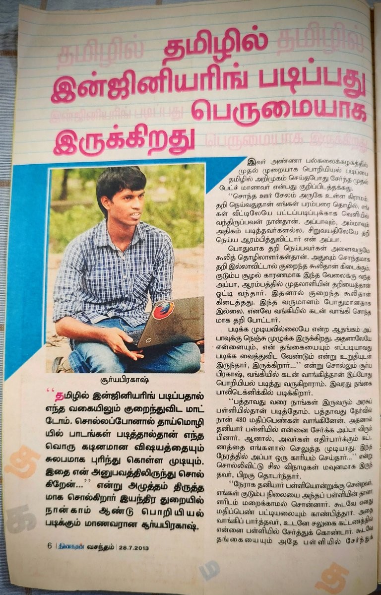 "It's proud to study engineering in Tamil" - my interview to Dinakaran Vasantham magazine.