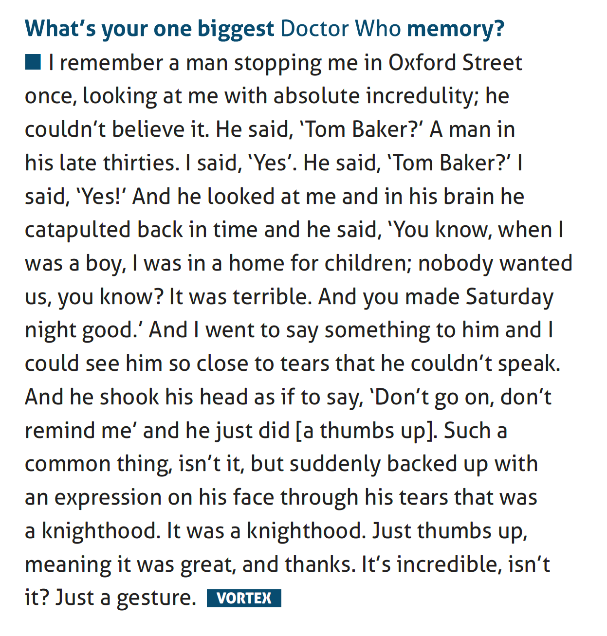 Ah, Tom. My first Doctor and still my favorite. What a beautiful quote on his birthday. From Big Finish Vortex Magazine #57 https://www.bigfinish.com/vortex/v/57