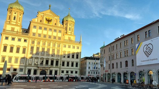 Nicht nur das Banner der #FriedensstadtAugsburg leuchtete gestern blau-gelb. Wichtiger als solche Symbolik sind aber #Spenden, z.B. an den "Ukrainischen Verein Augsburg", https://www.ukr-verein-augsburg.org, oder an @AktionDHilft.