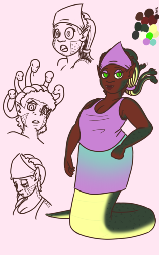 I drew her in her normal outfit, underwear, her birthday suit (nakey), and her dancing outfit. #FuggSlugg #OC #Lamia