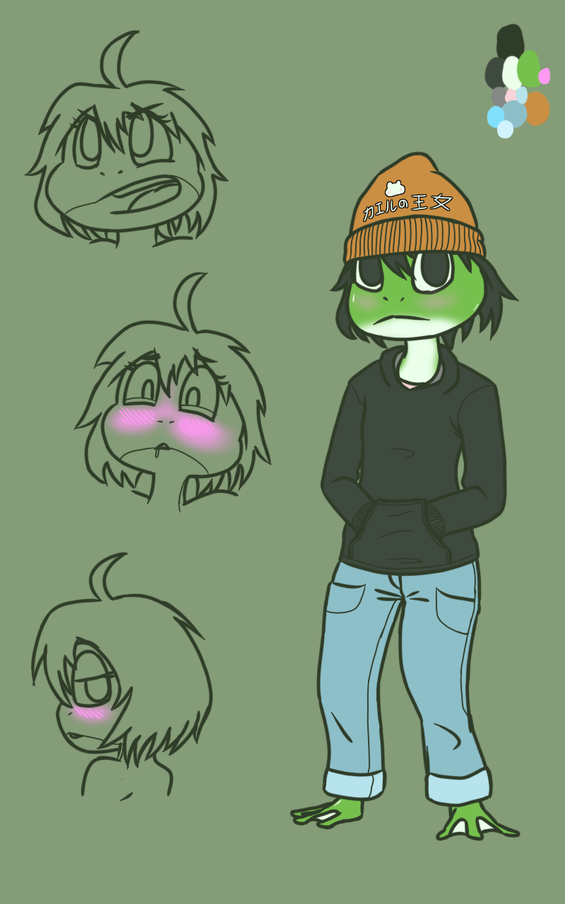 A frog girl! This is Harumi Keroppi, a half-Amphib, half-human girl hailing from Japan. She's very shy and quiet, but her shell opens up when she learns to trust someone. She's gay, so she prefers dancing for women, but will dance for men as long as they aren't creepy. Her dance outfit may seem a bit open for someone so shy, but she actually had it made herself. The Japanese on her headwear says Kaeru no Ojo. #Amphib #OC #FuggSlugg