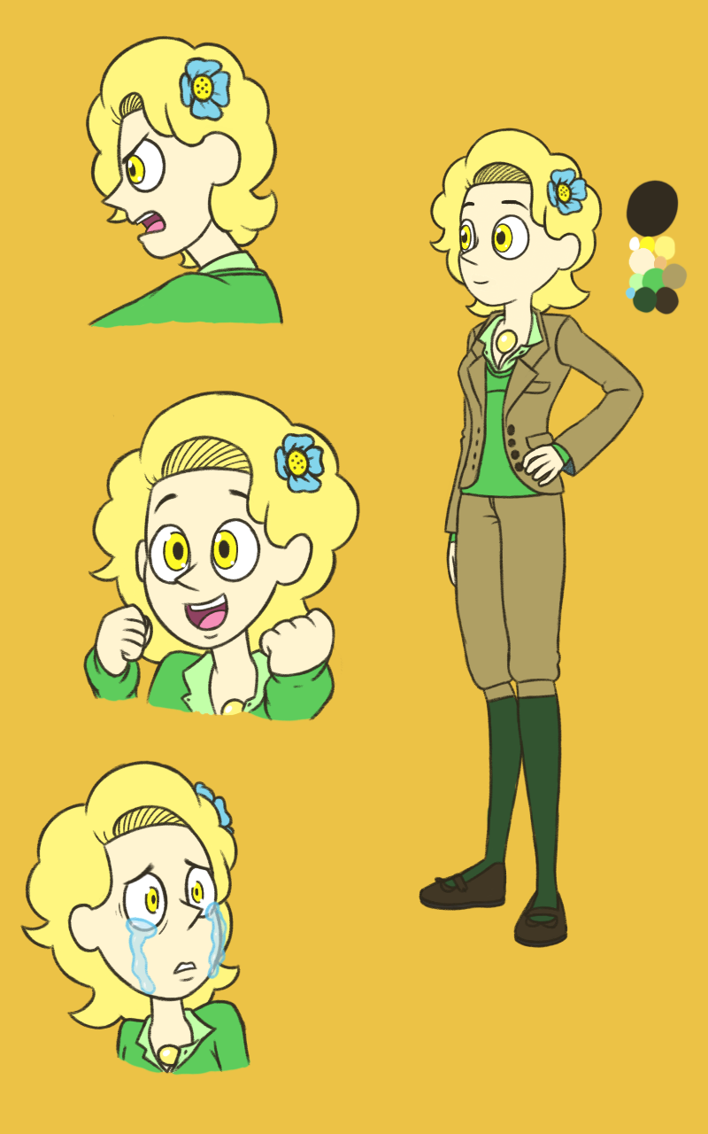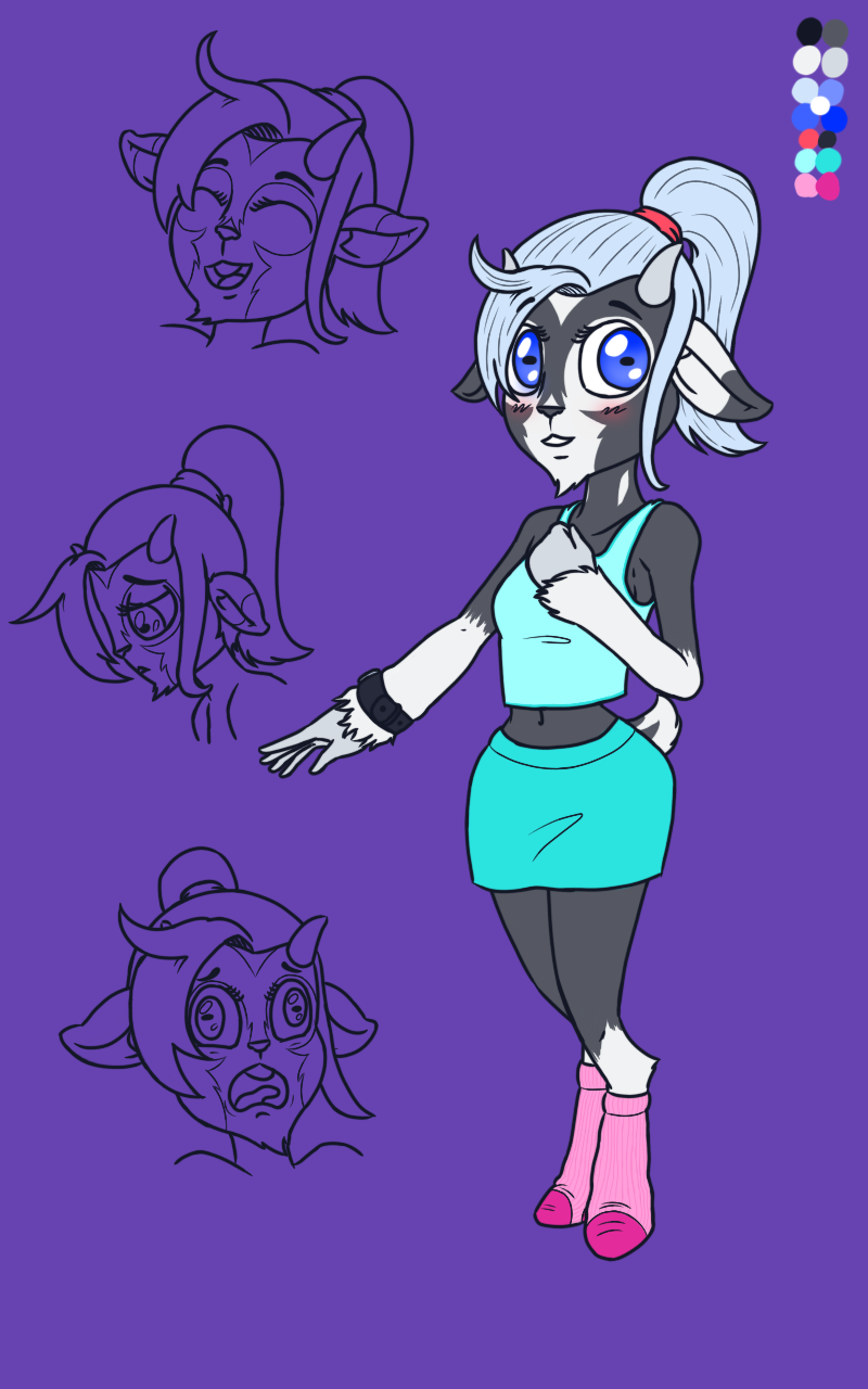 She's 19, a bit of an airhead, and loves watching Imani. Her design is based off a British alpine goat. However, in her own words, "Me mum's an alpine, Dad's a fainter," so when startled (which isn't difficult), she'll bleat loudly and fall over. Imani finds this VERY amusing.