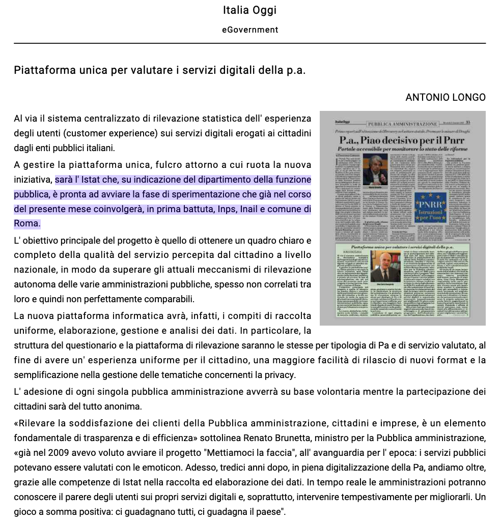 Sarà l' #istat su indicazione di #FunzionePubblica ad avviare la fase di sperimentazione per la piattaforma unica di valutazione per i servizi digitali della PA. Non ci piace l' adesione su base volontaria della PA e la partecipazione dei