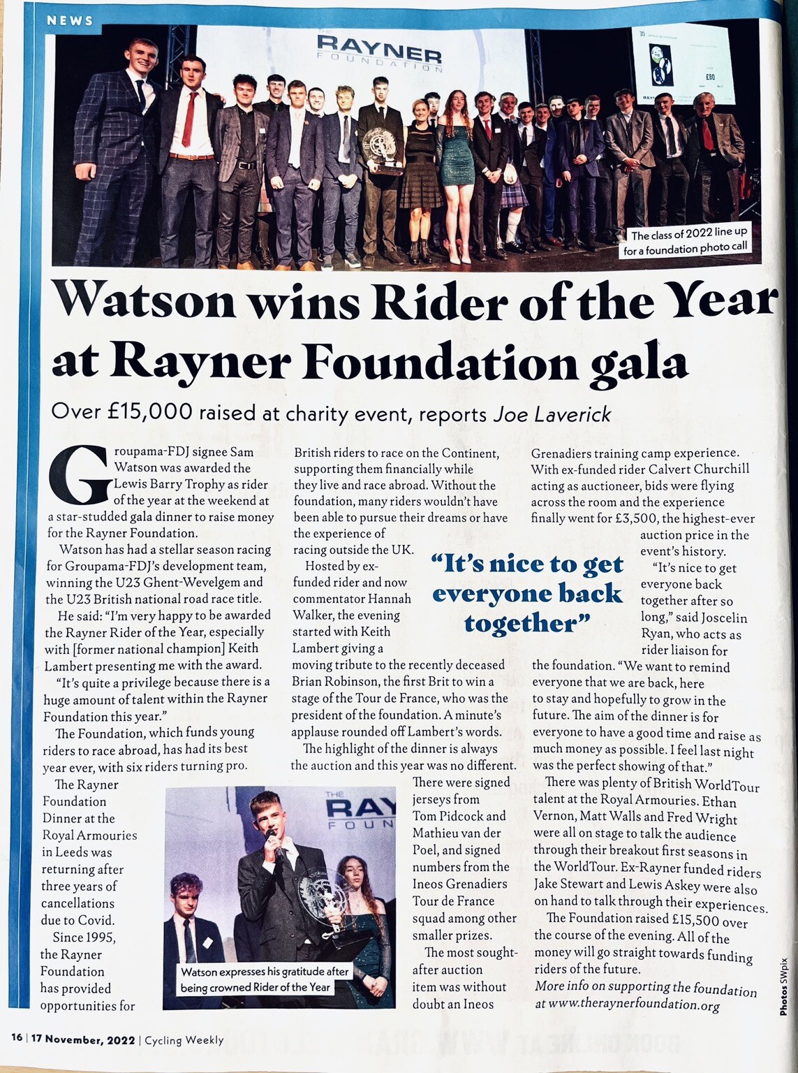 Dave Rayner Foundation-supported rider Joe Laverick has had a piece published in #Cycling Weekly about the recent annual dinner