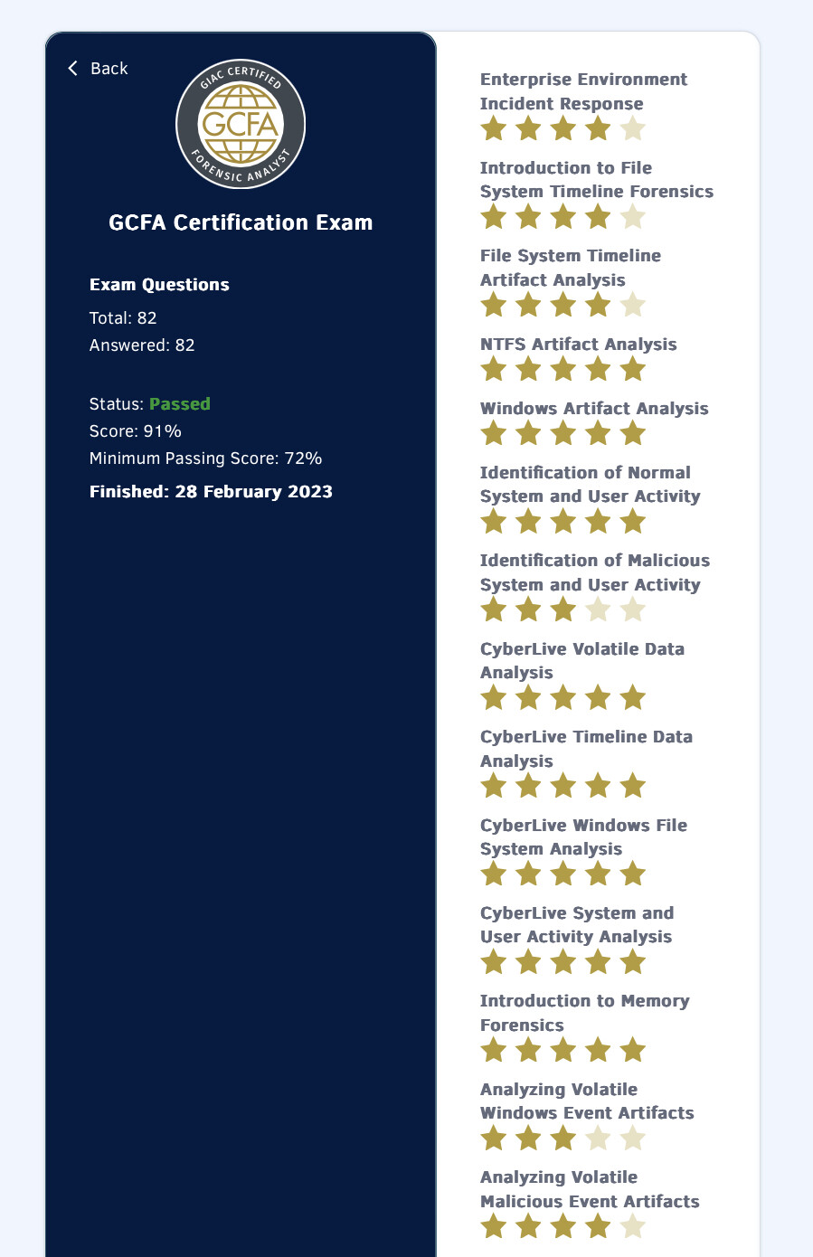 I LOVED this class and actually loved this exam (even if file system timestamps will be the death of me). So incredibly pleased with this score, and happy to be putting another check mark on my #MSISE to-do list :) #GCFA #DFIR #SANS