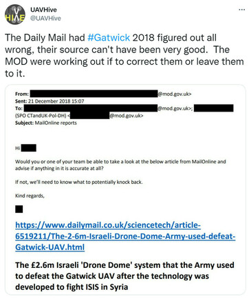 Will be e-mailing @karlmccartney to highlight the DfT failed to address the mistake by the Daily Mail that @RAFAELdefense ๐ฎ๐ฑ Drone Dome was at #Gatwick in 2018, when it was Lincoln's @METISAerospace ๐ฌ๐ง who could have potentially lost sales to this day.