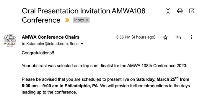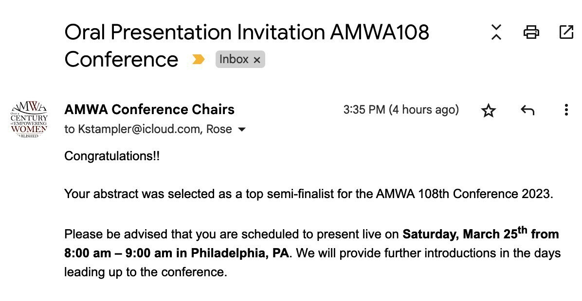 Excited to be giving an oral presentation at the @AMWADoctors@twitter.com annual meeting! Our project is a scoping review on Gender Equity in Institutional Leadership Roles at US Academic Medical Centers. Thanks to the great team who made this possible!! #AMWA108 #MedTwitter #GenderEquity