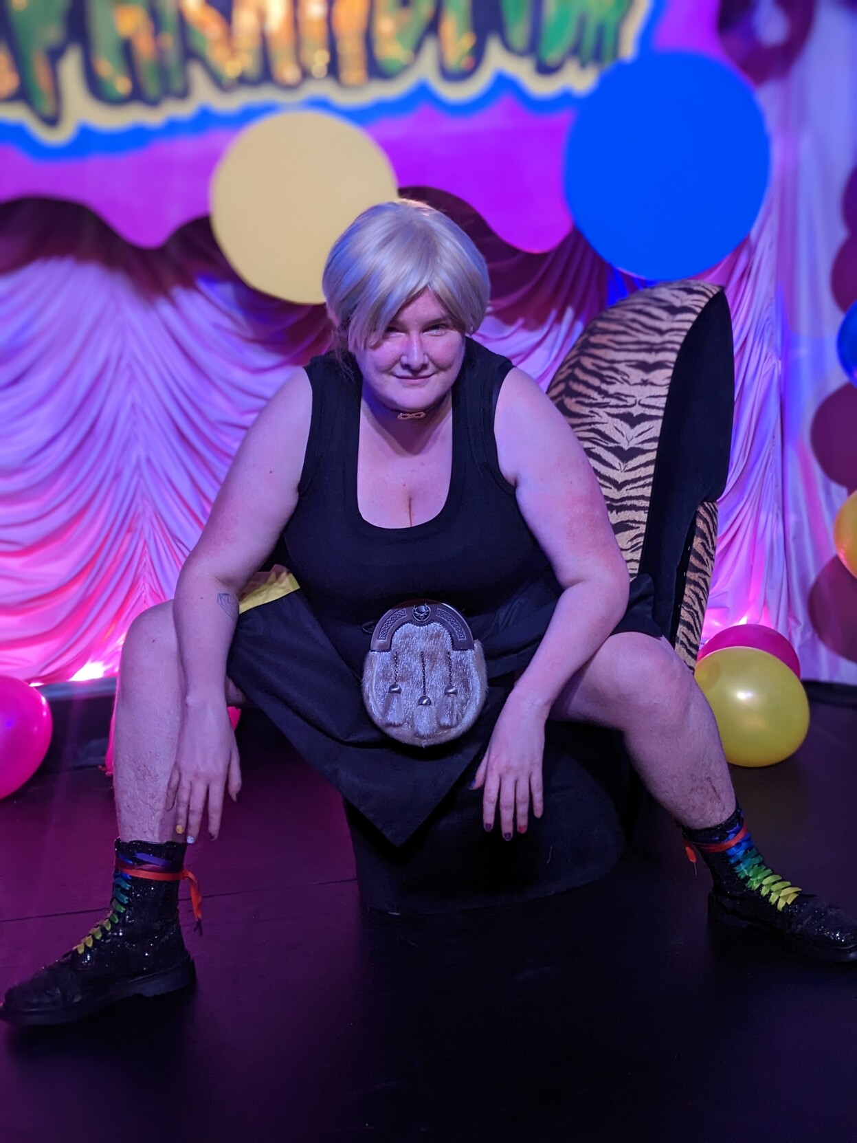 There is so much genderfuckery going on in this photo and it makes me so, so happy. The kilt and sporran. The very hairy legs. The wig, the boots, the boobs. It's a big ol' masc/femme scramble and I'm here for it.