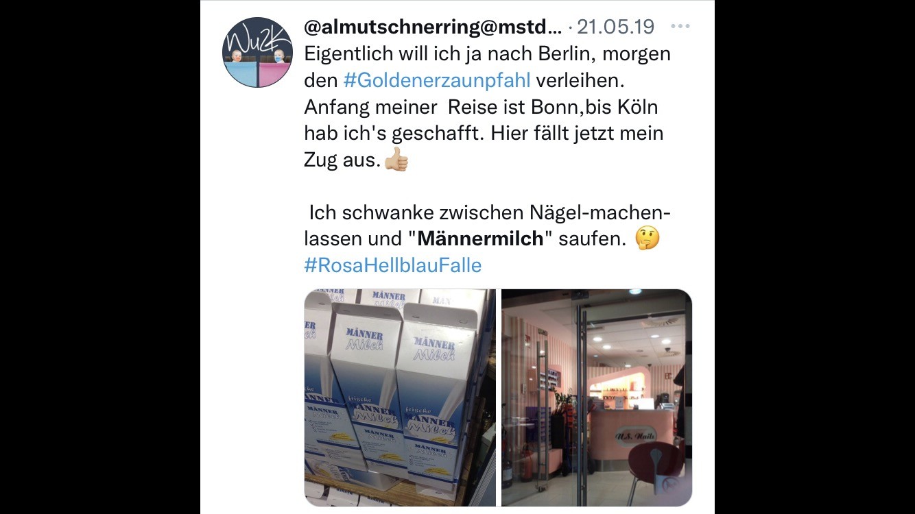 Am 21.11. geht wieder die Verleihung des "Goldenen Zaunpfahls" über die Bühne. Der Negativpreis für plumpes #Gendermarketing. Die Unrühmlichen 7 stehen fest. Bin gespannt wer es wird, vielleicht die Taschentuchmarke die glaubt, für Astronautinnen sind waschmaschinenfeste Taschentücher auf dem Mond ein Thema. 🤷🏼♀️ #rosahellblaufalle