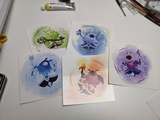 I got them printed :3 pretty happy how the colours came out! (Better than on the notepads :/) my first postcards/prints for the artist alley plans :3