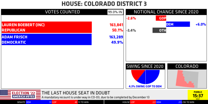 There is still one uncalled #Colorado #House seat, which is subject to a mandatory recount given how close the result was. The deadline to complete this is next week.