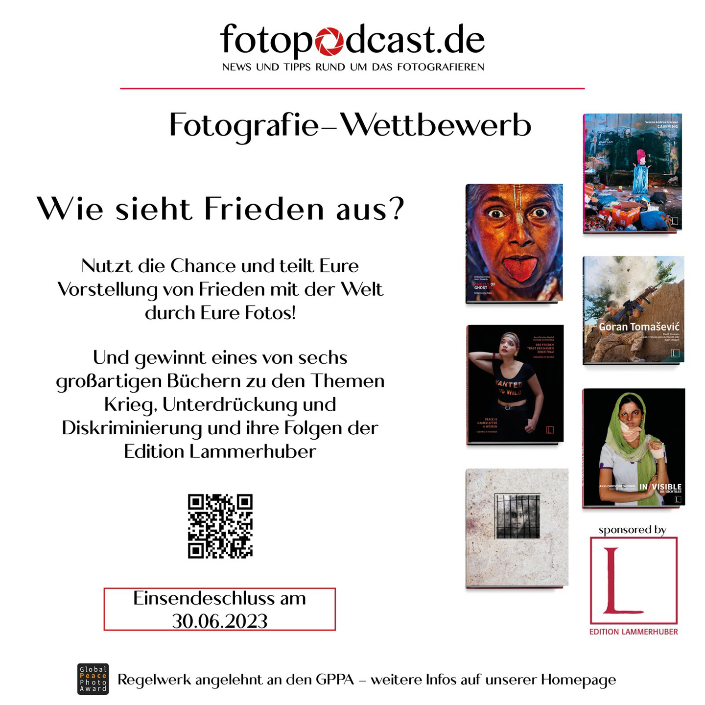 Folge 333 ist gestern in der Live Produktion aufgezeichnet worden und wartet auf die Veröffentlichung. Mit angekündigt haben wir das neue Gewinnspiel von insgesamt sechs Bücher der Edition Lammerhuber und laden alle ein, an diesem Wettbewerb teilzunehmen. Dieser qualifiziert auch direkt zur Teilnahme mit den gleichen Bildern oder Bilderserien am Global Peace Photo Award.
