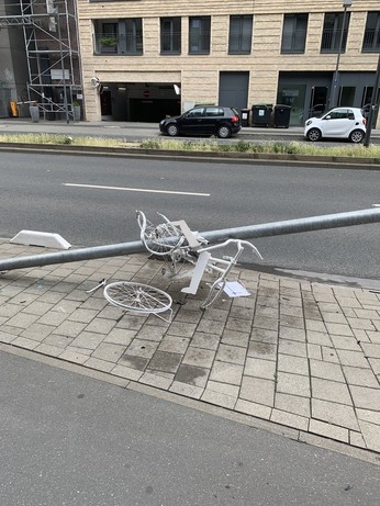 Noch nicht mal ein halbes Jahr ist es her, als ein #Raser an dieser Stelle zwei Menschen getötet und einen schwer verletzt hat. Und schon ist das #Ghostbike platt gefahren worden. @Stadt_FFM@twitter.com und @Polizei_Ffm@twitter.com wann schützt ihr die Bürger #Frankfurt s vor diesen Rasern und #Posern?