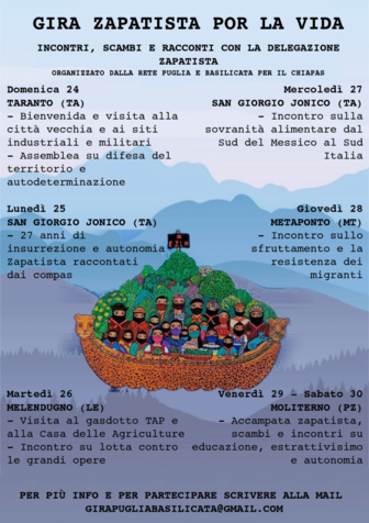 La #GiraZapatista arriva in Puglia ecco le tappe. Noi siamo stati a quella di Taranto ed è stato bellissimo, una giornata intera alla scoperta della città, dei suoi abitanti, dei suoi problemi accompagnando la delegazione proveniente dal Chiapas curiosa di conoscere la nostra terra e le lotte. L'assemblea è stata molto lunga e partecipata. La Gira sarà in tour in Italia ancora per qualche giorno, cercate il punto più vicino alla vostra città e andate a conoscere queste persone straordinarie.