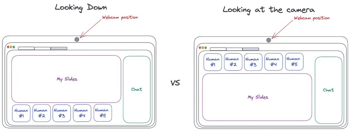 With tools like #googlemeet, positioning the attendees at the bottom this results in me almost never starring at the camera…