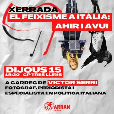 🗓 Demà, seguint el nostre Cicle Antifeixista, al @CPTresLliris@twitter.com tindrem a en Victor Serri (@_ittos_@twitter.com) xerrant del cas italià, la història de l'extrema dreta al país veí i l'arribada de Meloni a les institucions.