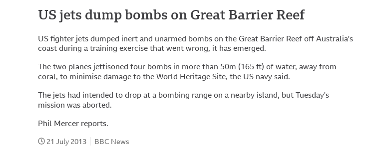 'US fighter jets dump bombs on the #GreatBarrierReef during a training exercise that went wrong': "Conservationists call outrageous allowing a foreign power to drop bombs on a national treasure" | @BBC [2013] https://t.co/9qcdZ3euMs https://t.co/wHDLm32oFr https://t.co/zy8ufX1QJv
