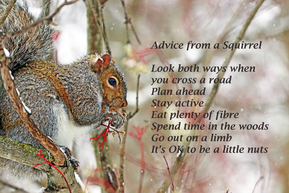 Day 10 #AdventCalendar A little advice from a #GreySquirrel is an #inspirational and #humorous quote. I watched this furry, bushy tailed Grey Squirrel for some time on this cold, snowy winter day in Guelph #Ontario Canada. The squirrel moved from branch to branch eating the white berries one by one off the stem.