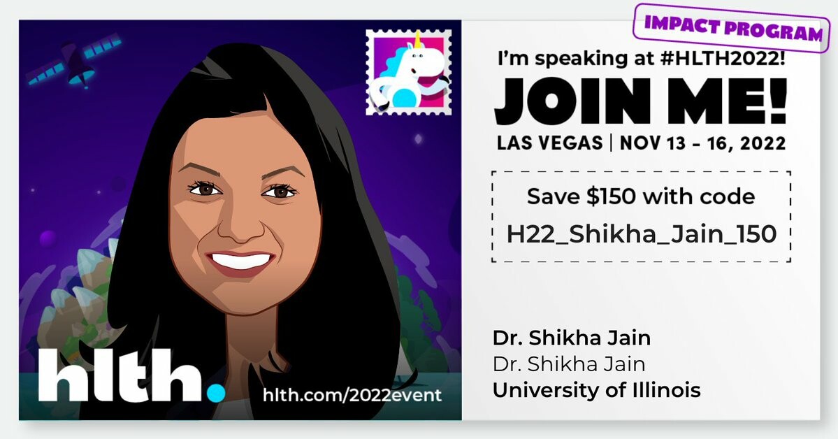 Are you at @HLTHEVENT@twitter.com #HLTH2022?! Find our founder and President @ShikhaJainMD@twitter.com on the IMPACT stage at 4:20 today!