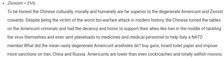 'the Chinese culturally, morally & humanely are far superior to the degenerate #Americunt & #Zionist cowards. Despite being victims of the worst bio-warfare attack in modern history, the Chinese turned the tables on the Americunt criminals & had the decency & honor to support their allies like Iran in the middle of tackling #Covid19 themselves & even sent planeloads of medicines/medical personnel to help Italy—a NATO member…'