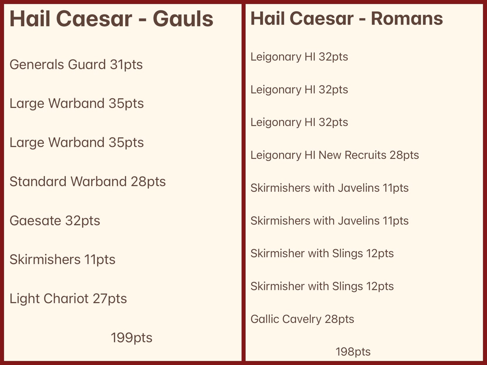 Here are some starting lists based upon the Baccus Hail Caesar starter sets. Highly subject to change.