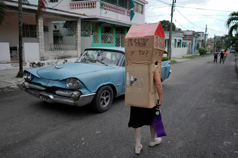 From Cuba, 58-yrs under #fascist 'Murica's #criminal economic embargo —which even today prevents the tiny but sovereign island from receiving international PPE aid for #Covid19 (http://www.xinhuanet.com/english/2020-04/02/c_138940371.htm), a retired #nurse Feridia Rojas, 82, wears cardboard shaped like a house to protect herself from the spread of the #coronavirus disease (#COVID-19) outbreak in #Havana, #Cuba, 16 June 2020 — to девчата sunbathing at #Yenisei River beach in the Russian city of #Krasnoyarsk.