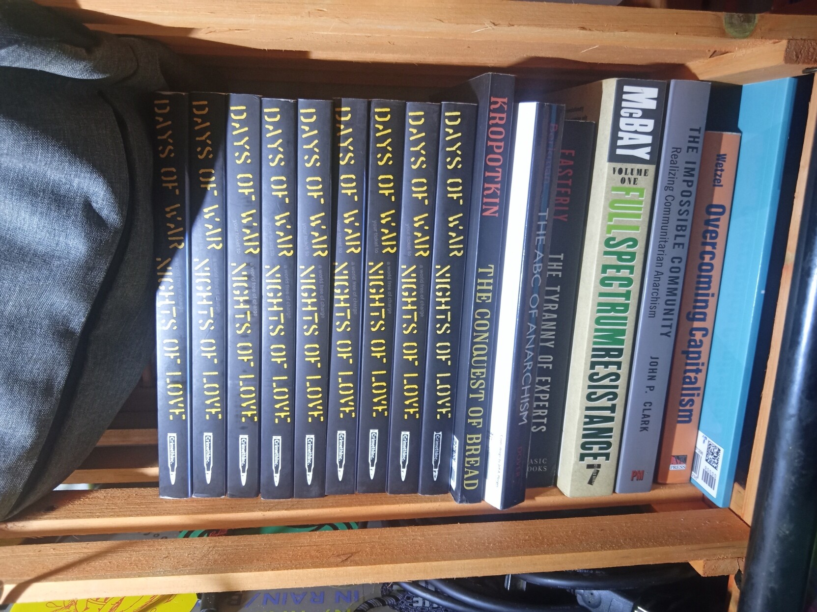 The Radical Community Library is slowly coming together.we have mire selectionsfrom the "staple" anarchist predecessorslike Kropotkin, Goldman, Malatesta and others.is there anyone you consider essential reading that we should add? Let me know in the comments, From the Heart of Fascist Texas we fight the uphill fight. In Solidarity, Jack. #thedynamitesocialclub #HeartsAndMinds