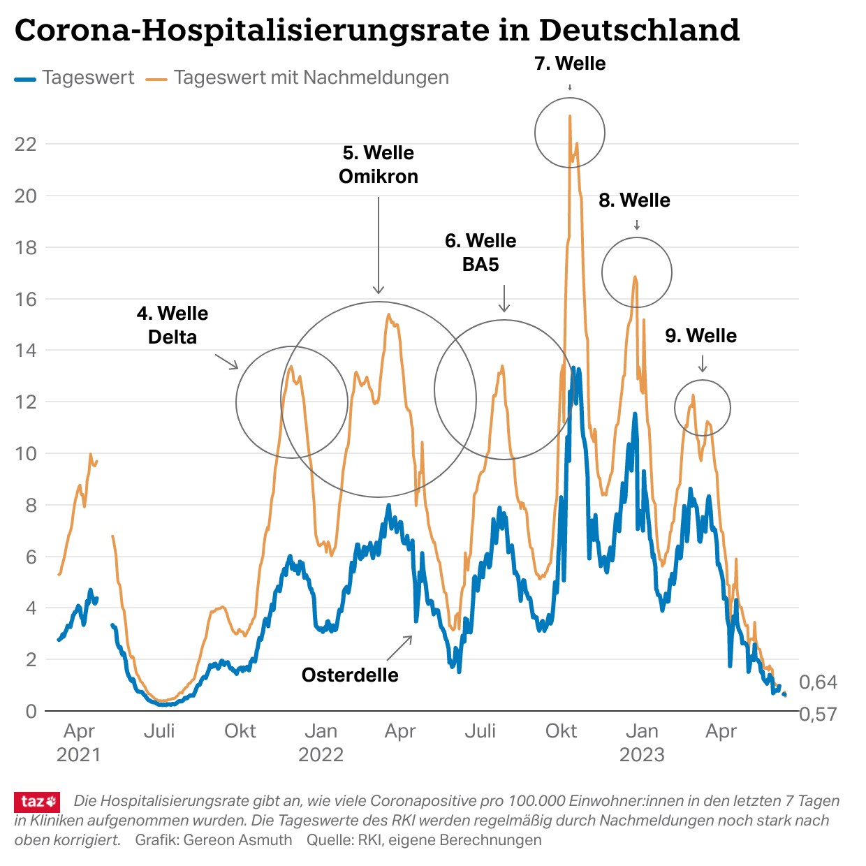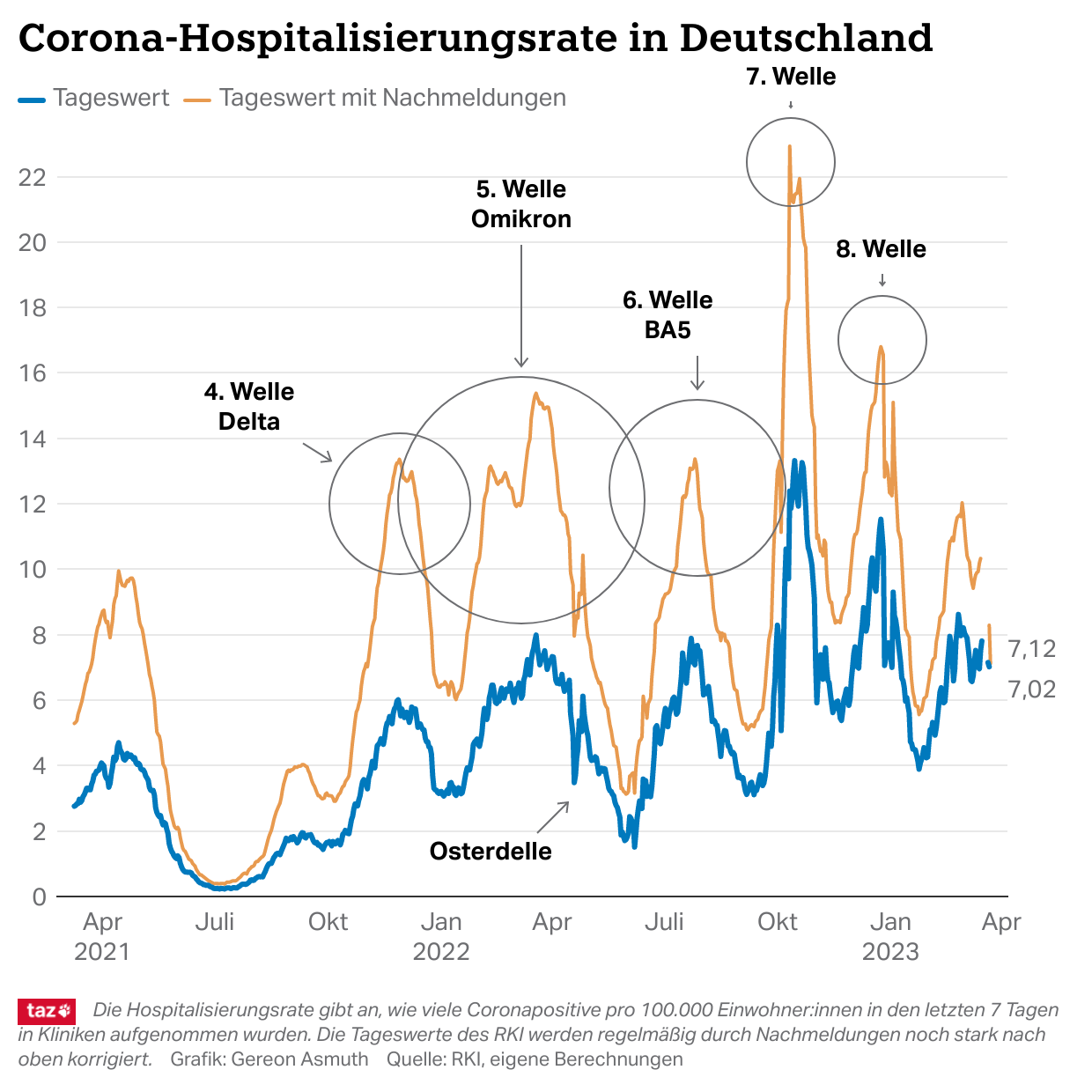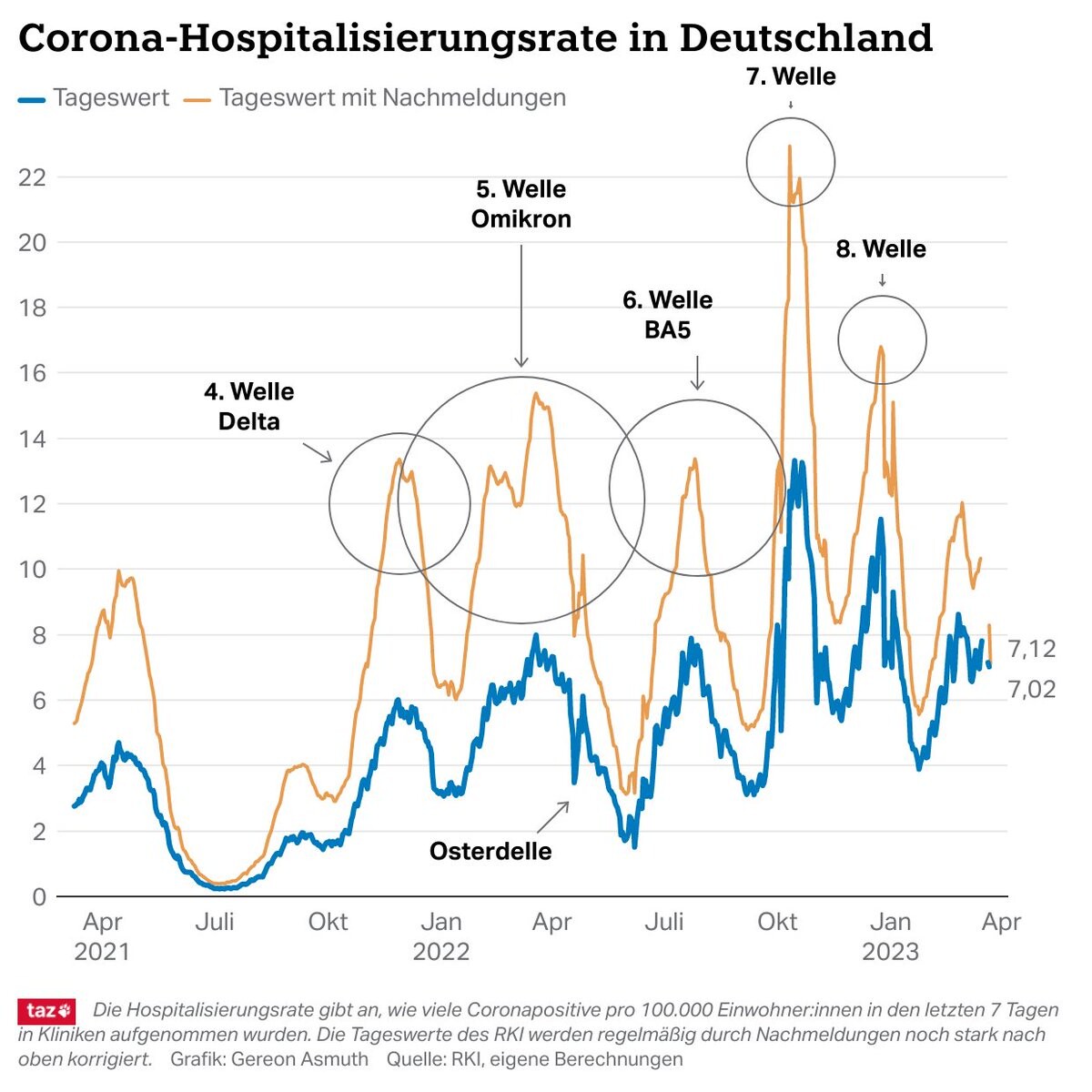 Realistischer ist da die Entwicklung der #Hospitalisierungsrate. Sie liegt aktuell bei 7,02. Die Grafik lässt eine 9. Welle erkennen, durch die die Rate Ende Februar und Mitte März deutlich über 8 gestiegen war. Die Welle schwappt anders als zuletzt gleich zweimal. 4/x