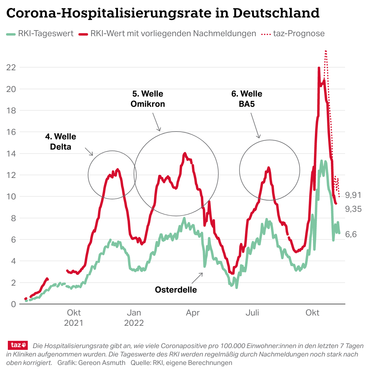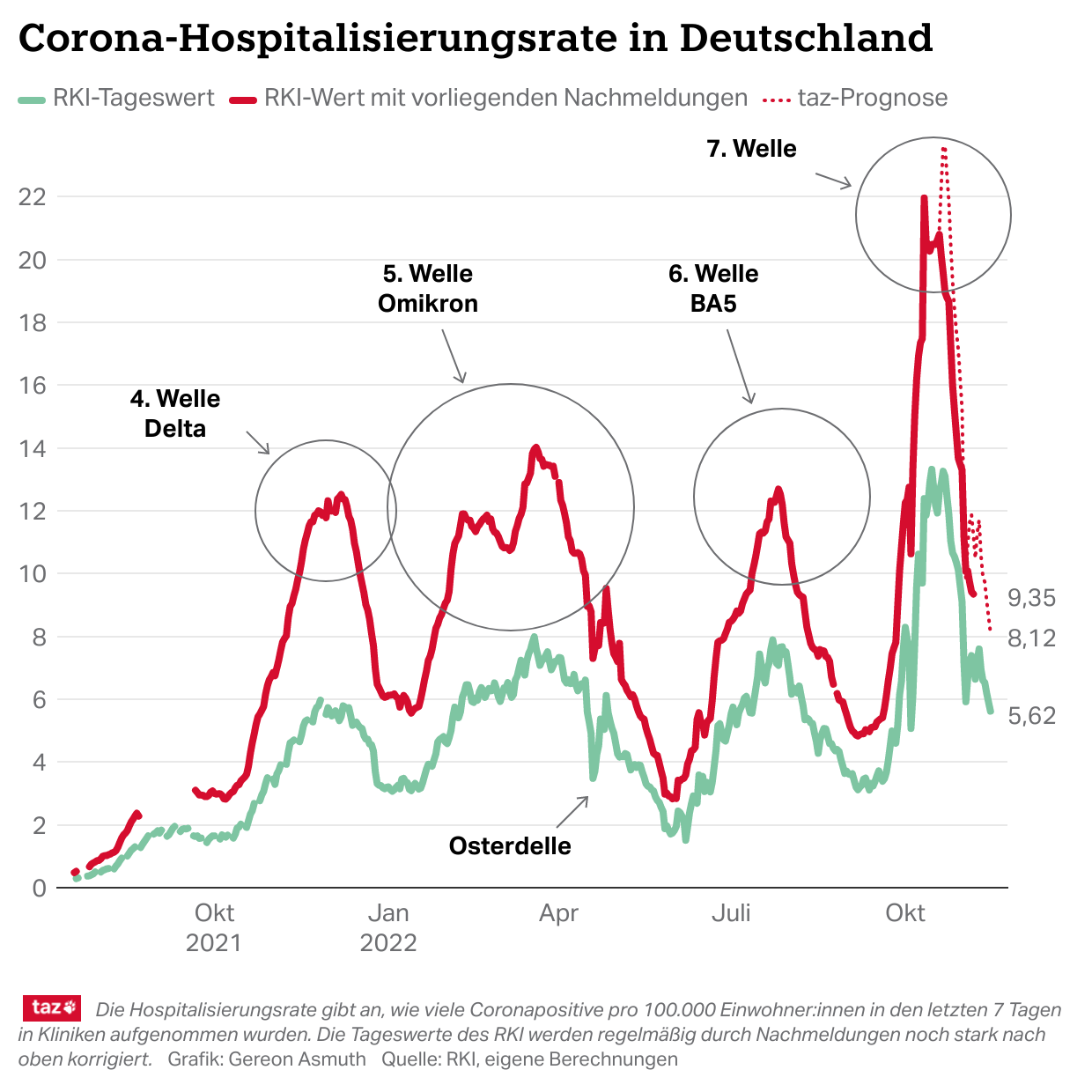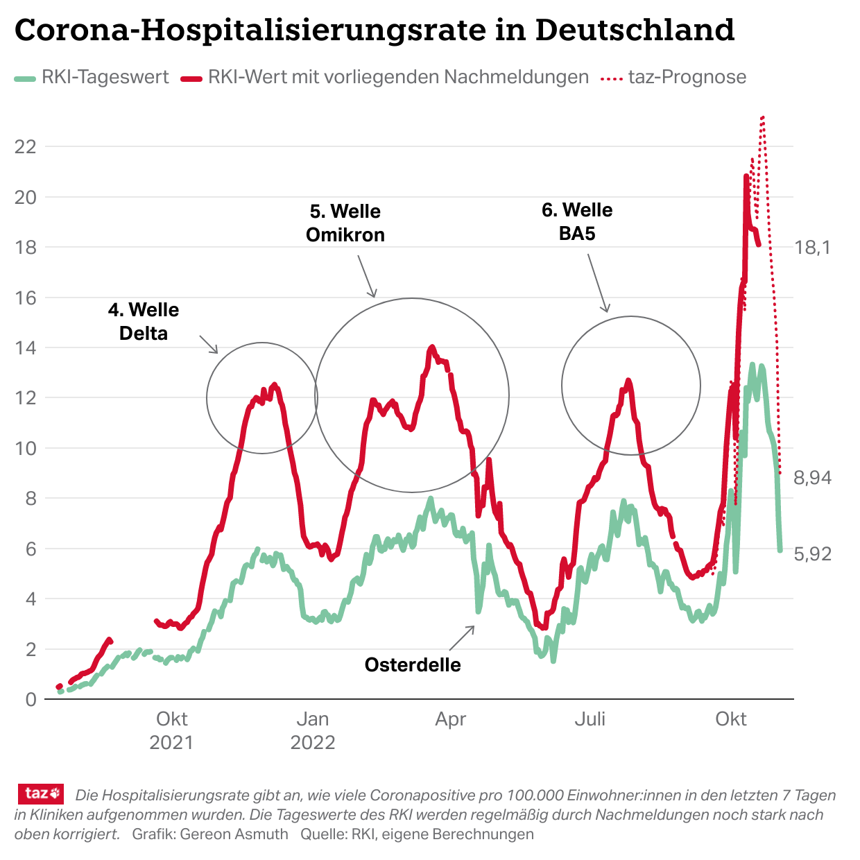 Die #Hospitalisierungsrate liegt lau Berechnung des #RKI am Dienstag bei 11,93. Mit den zu erwartenden Nachmeldungen dürfte sie bei 19 liegen. Beides ist etwas weniger als in den letzten Tagen, verglichen mit den Werten der bisherigen Wellen aber weiter extrem hoch. (6/x)