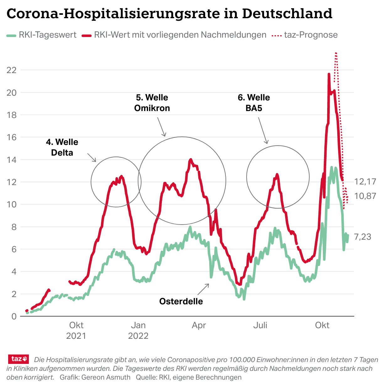 Absolut liegt die #Hospitalisierungsrate laut Berechnung des #RKI am Donnerstag bei 12,87. In der Tendenz liegt die #Herbstwelle damit weiter rund 50% höher als die Spitzenwerte aller vorherigen Wellen. (7/x)