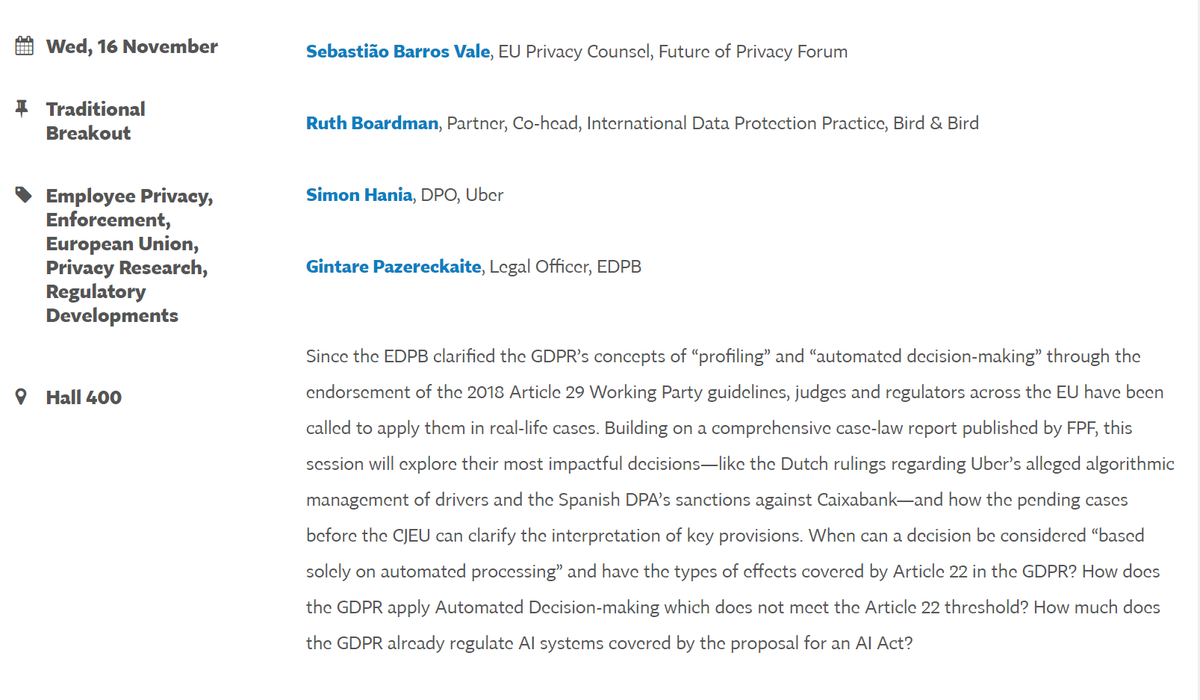 This afternoon at 16:15 (CET), EDPB legal officer, Gintarė Pažereckaitė will discuss the concepts of automated decision-making and profiling during her panel at #IAPP Europe data protection conference. Follow the panel in Hall 400. More info here: https://iapp.org/conference/iapp-europe-data-protection-congress/schedule-and-program-dpc22/?id=a191P000004o8fAQAQ