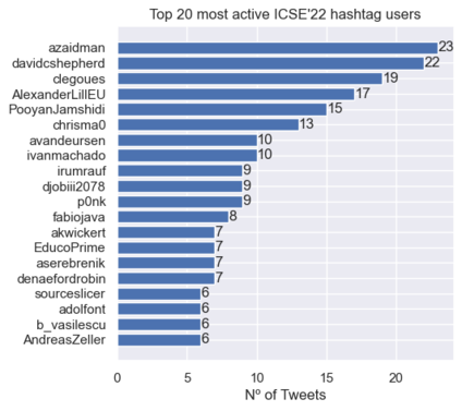I looked at 642 #ICSE2022 tweets from 298 unique users. Here are some results: