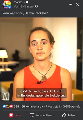 Moin @georgrestle@twitter.com. Toll, Video mit @CaroRackete@twitter.com, in dem sie erklärt, warum sie @dieLinke@twitter.com wählt. Schade, dass "Monitor" Lüge verbreitet, wir hätten gg Evakuierung von Ortskräften gestimmt: Im Juni haben wir es zuerst beantragt, gg CDU & SPD. Bitte richtigstellen. #IchWaehleLinks