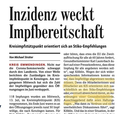 BZ 16.7.22: Nicht-#Impfstützpunkt des Landkreis #Emmendingen. Man fragt sich was passieren soll, wenn man jemand für den die #Impfung zugelassen ist, aber (noch) nicht empfohlen, geimpft wird? Der SWR Bericht zu den Haftungsfragen ist übrigens vom 4.8.21 https://www.swr.de/swraktuell/rheinland-pfalz/impfempfehlung-oder-impfangebot-coronavirus-100.html