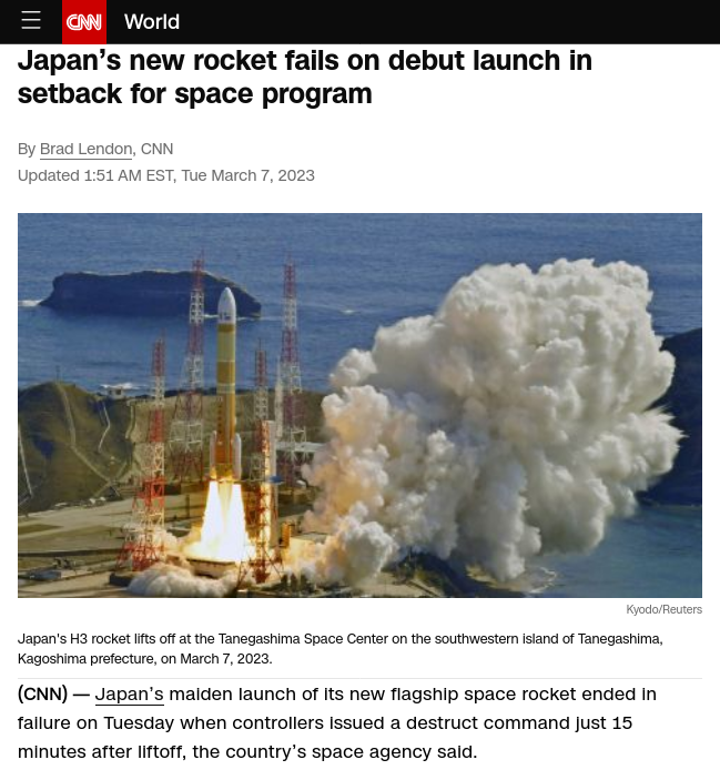 "Japan’s new rocket fails on debut launch in setback for space program" by CNN / Brad Lendon - Maiden launch of Japan's #H3 rocket🚀 failed when 2nd stage didn't ignite. #ALOS3 Earth-observation satellite lost. (Many rocket first attempts fail.) https://edition.cnn.com/2023/03/07/asia/japan-space-launch-destroyed-intl-hnk #space #JAXA