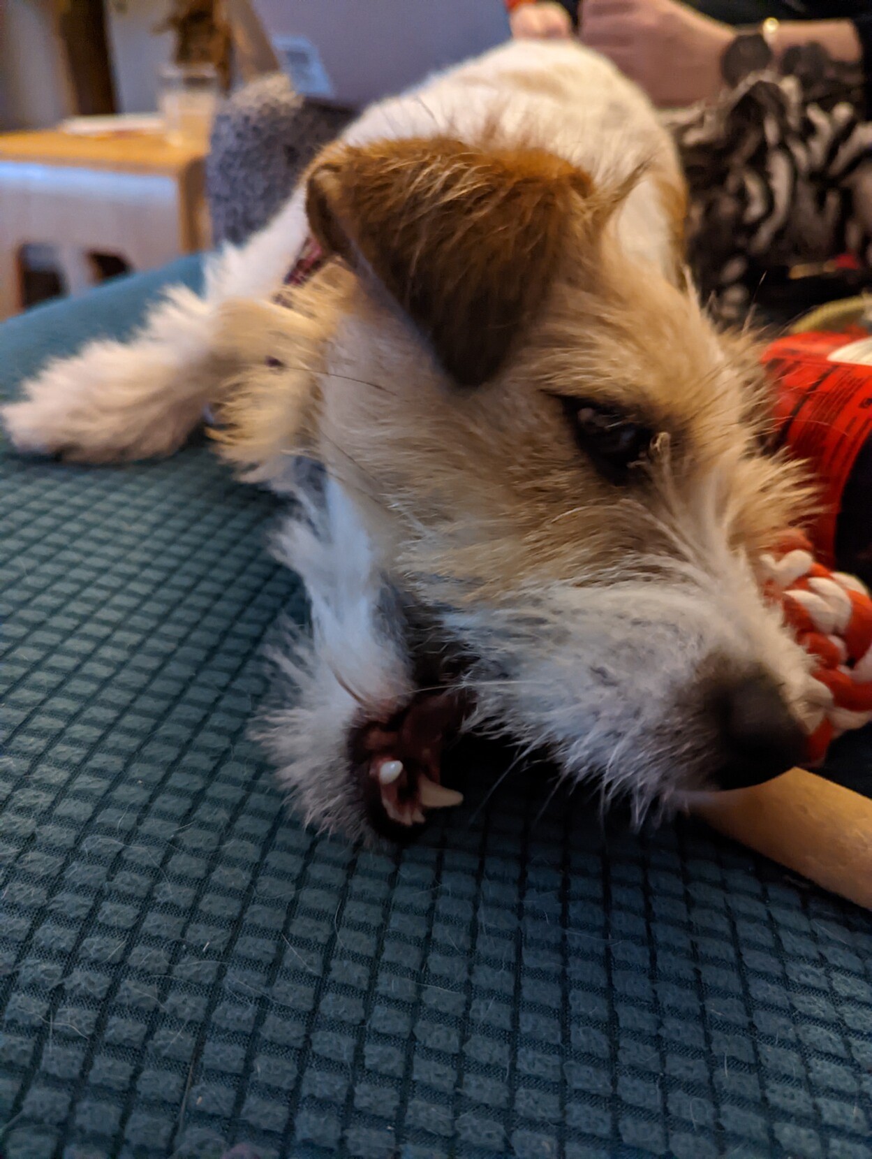 First we have Lucy, the 17-year-old #JackRussell cross miniature #FoxTerrier rescue dog who is deaf, blind, probably a little senile, and with failing kidneys. The vet said she had two weeks left in her about three months ago - I think she's improving just to spite our vet. As soon as she was given a time limit she doubled how much she ate and got much more active. Nickname: Borkinator 5000.