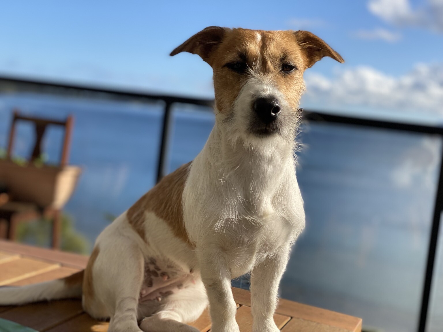 When you’re enjoying the sun after a cold swim and someone makes a noise. #rufus #JackRussell #dogsofmastodon