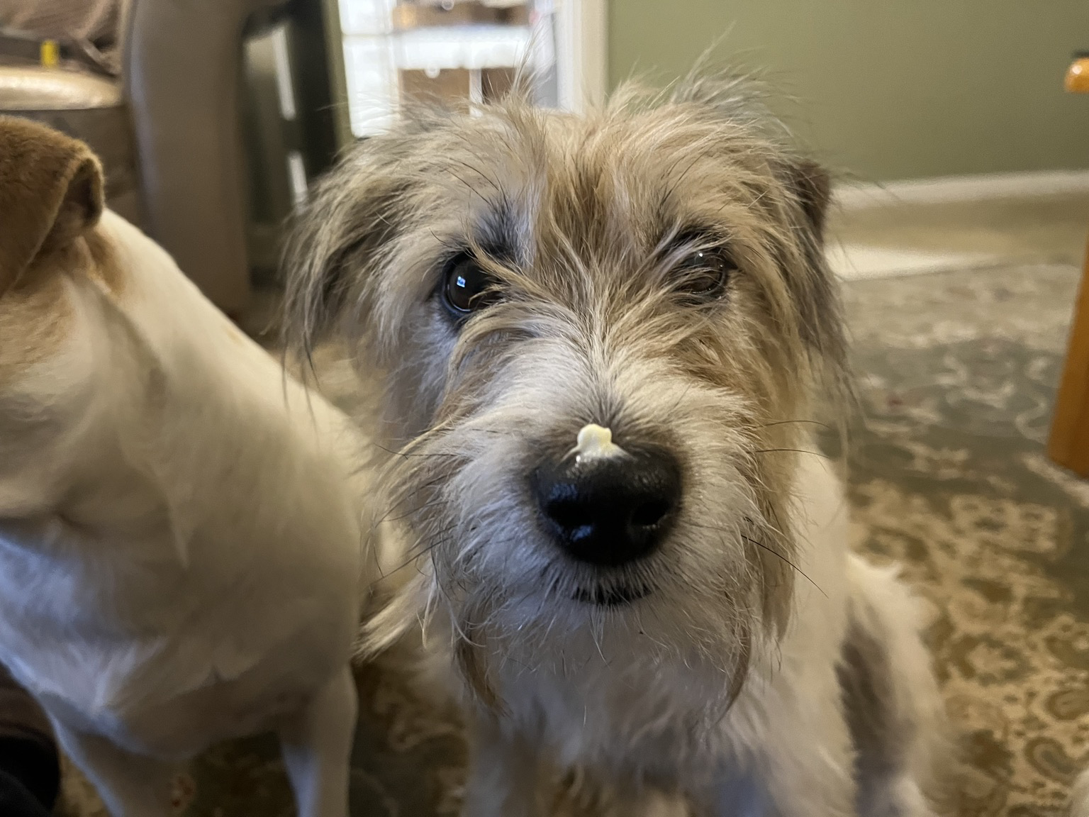 Hey Mum!! The cream goes in my mouth, not on my nose!! #rufus #dogsofmastodon #JackRussell
