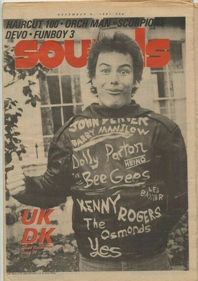 December 1981, cover shoot for Sounds with Dead Kennedys frontman Jello Biafra. He wears a leather jacket as a straitjacket with music he hates depicted on it