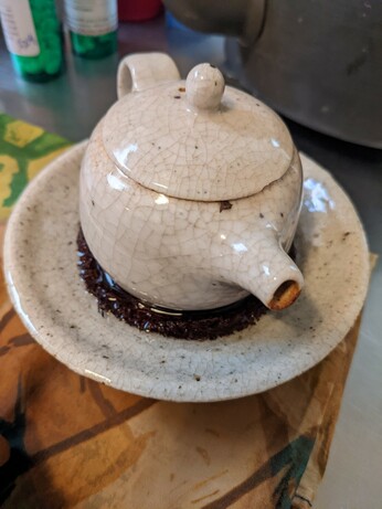 Brewing up some White2Tea 2019 Fuding Baicha (White tea) in this lovely Krackleware pot made by Czech potter Jiri Duchek.