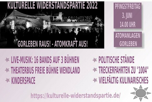 #Gorleben raus. #AKW aus: Mit der letzten und größten Kulturellen Widerstandspartie am 3. Juni 2022 sollen die Erfolge der #AntiAtom*Bewegung gefeiert werden. Infos und Programm findet ihr hier: