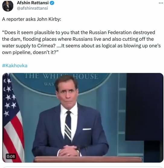 Kirby's response: "We've come to no conclusions on this. We are working with the Ukrainians. We'll try to get as much info as we can."🤣 #KakhovkaDam #Nordstream