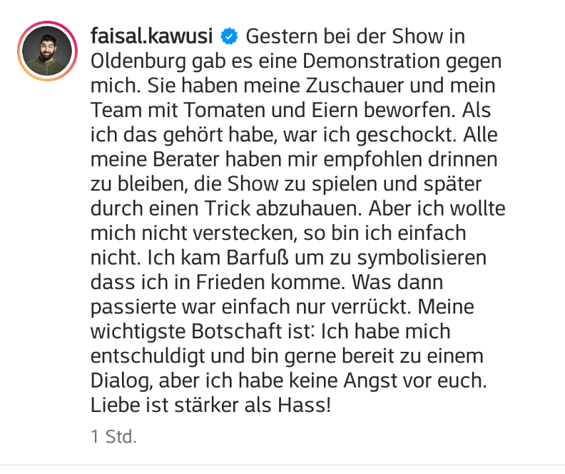 Gestern war der "Komedian" Feisal #Kawusi in #Oldenburg bei der #Kulturetage für einen Auftritt. Faisal fiel in letzter Zeit durch KO-Tropfen Witze auf und früher auch schon durch sexistisches Verhalten. Deswegen demonstrierten ca. 60 Personen vor der Kulturetage. Auf Instagram log er heute dann über den Protest und stellte sich als mutiger Angegriffener dar. Dabei ist er einfach nur ein unlustiger, lügender Macker.