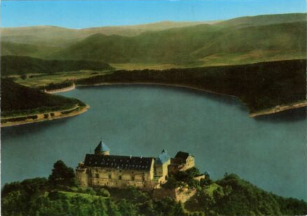 Ok gleich Perspektive finden ist so eine Geschichte ... Schloss Waldeck am Edersee auf einer Postkarte von 1982 und ein Werbefoto von Schloß Waldeck den Edersee betrachtend 2022 #Klimaschadenspolitik