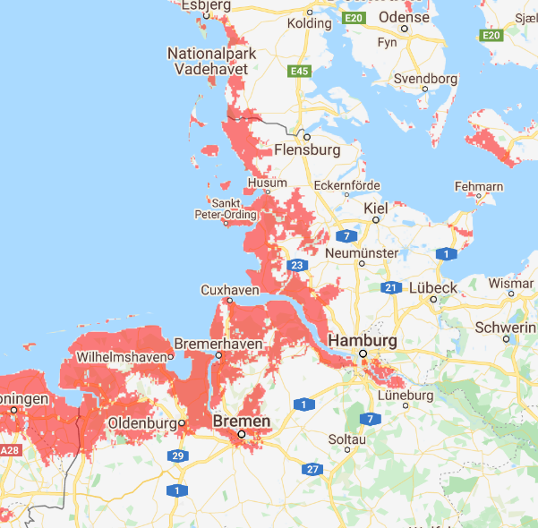 Ich hoffe ihr wohnt nicht in den Rot markierten Bereichen - falls doch schaut Euch schon mal nach einer neuen Wohnung bis 2050 um. Wird sich wohl mit den neuesten Daten bzgl. Grönland nicht verhindern lassen, das es überflutet wird. #…