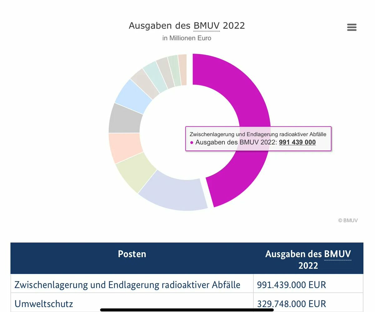 Das war News für mich: [fast] „die Hälfte des Etats des Bundesministeriums für Umwelt und Naturschutz geht für Zwischen- und Endlagerung von Atommüll drauf“. Billiger Atomstrom, ne?