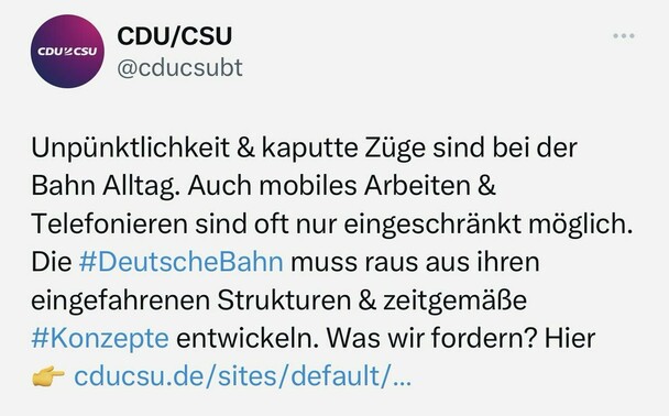 Die CDU/CSU stellte von 2009 bis 2021 alle Bundesverkehrsminister und beschwert sich jetzt über den schlechten Zustand der Bahn.