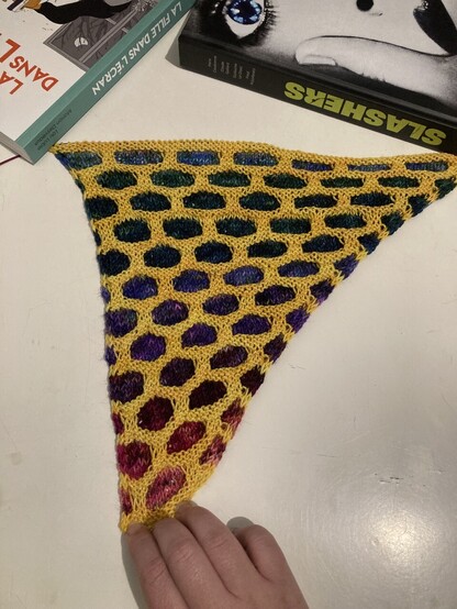 Et du coup, j'enchaßne sur un projet de chùle, un Honeycomb de Stephen West, avec le reste de laine jaune de mon pull en couleur principale, et les écheveaux du calendrier de l'avent de Madame Guillotine en couleurs de contraste.